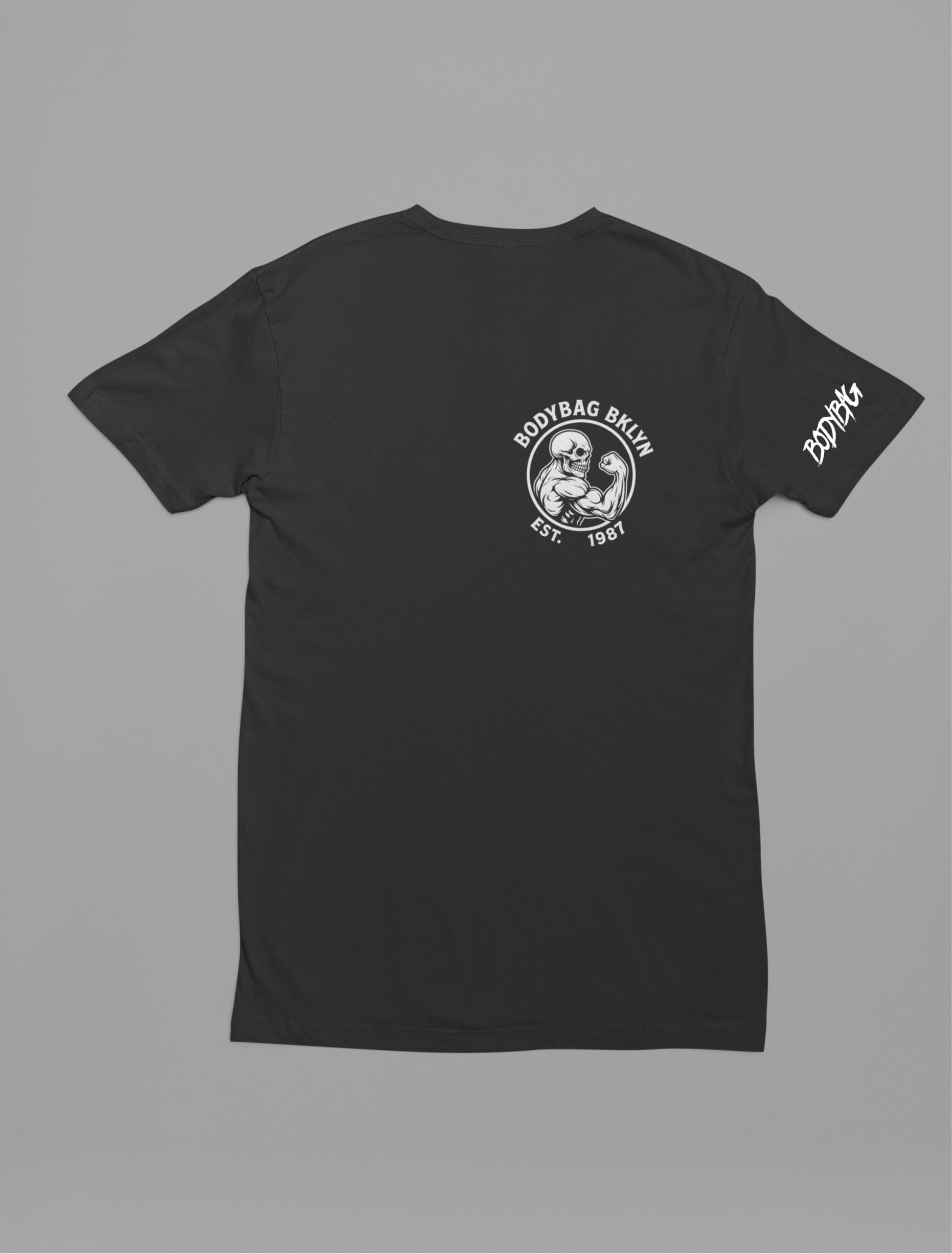 The Death Grip Strength design captures the raw energy that defines Bodybag BKLYN. Featuring a flexing skeleton with ripped muscle detail inside a bold circle frame, it symbolizes grit, endurance, and fearless attitude. The “Est. 1987” stamp roots it in legacy, while the graffiti-inspired sleeve hit gives it that authentic Brooklyn edge.