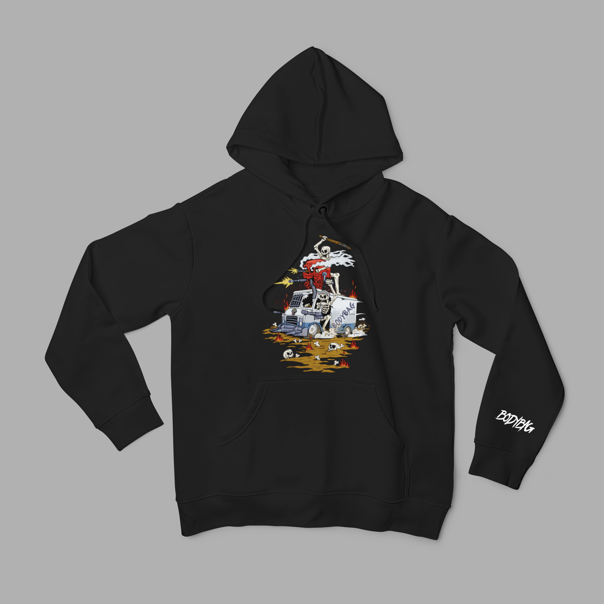 Take the streets by storm with The Last Ride. This bold design features a chaotic battle scene with skeleton soldiers unleashing mayhem from an armored truck branded with Bodybag. Flames, skulls, and destruction cover the ground as the undead crew tears through anything in their path.